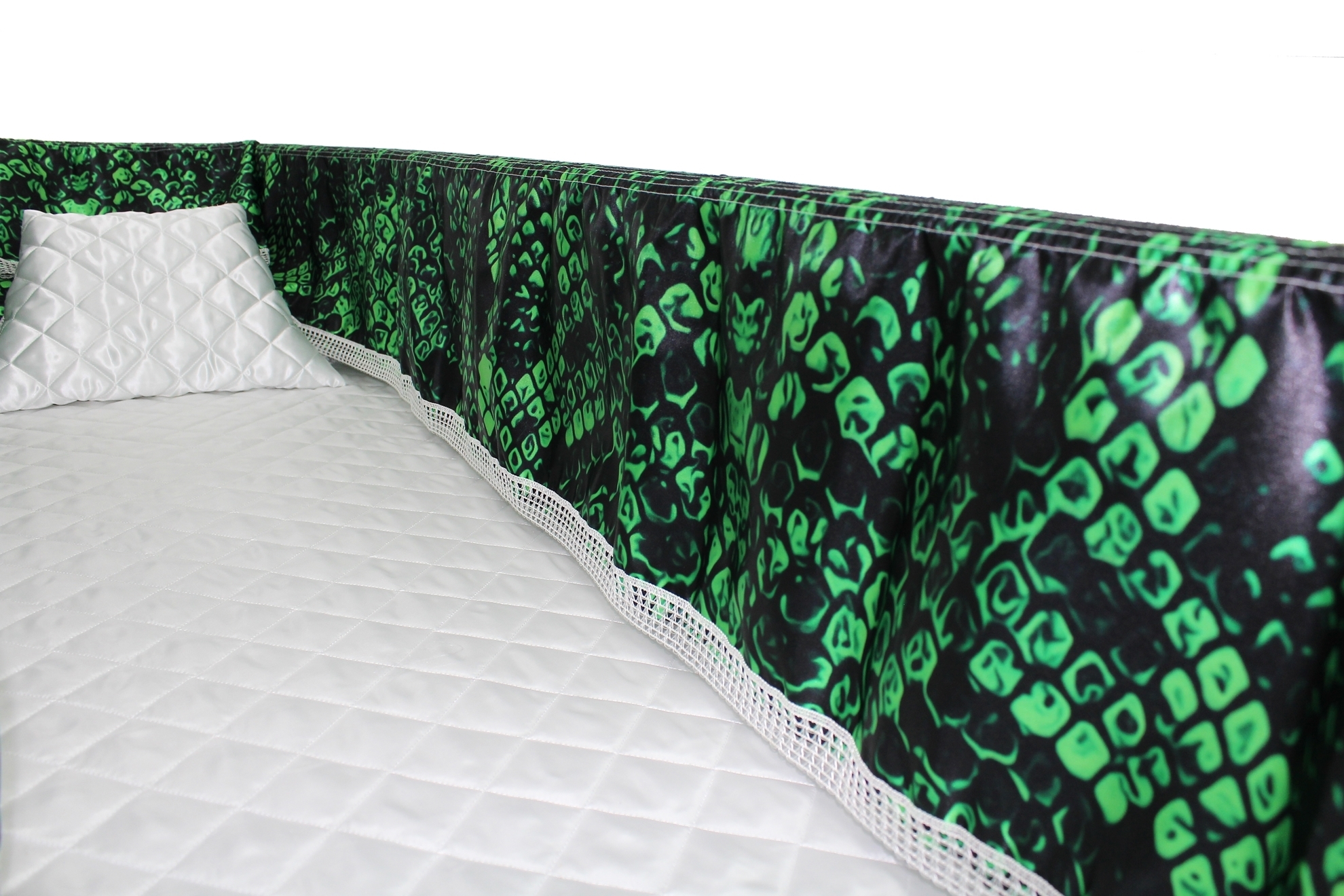 Luxury Satin 18-inch 2-way frill consisting of a 12-inch internal frill with an additional 6-inch exterior frill. The chosen design will be printed on the 18" 2-Way Frill. Please note the image shows a mattress and a pillow which are NOT included. Image is to illustrate style of Interior Only.