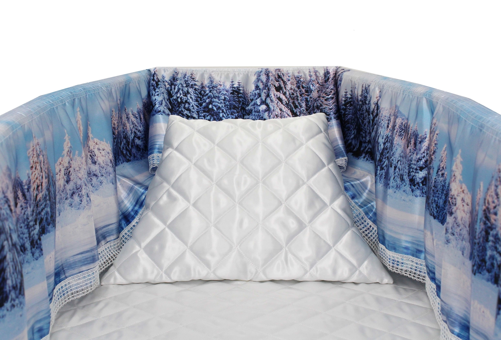 Luxury satin interior printed using water-based ink. The printed interior set consists of a 18-inch 2 Way printed satin frill, printed satin facecloth, quilted satin pillow and a quilted satin mattress.The chosen design will be printed on the interior. Image is to illustrate style of Interior Only.
