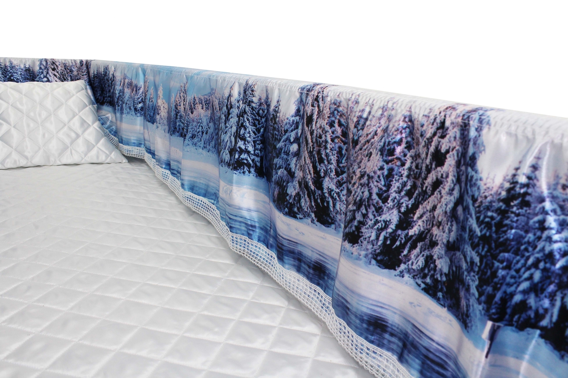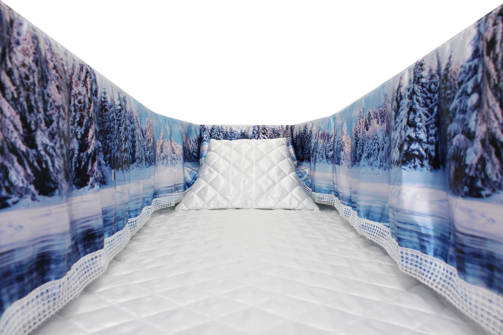 Luxury Satin 18-inch 2-way frill consisting of a 12-inch internal frill with an additional 6-inch exterior frill. The chosen design will be printed on the 18" 2-Way Frill. Please note the image shows a mattress and a pillow which are NOT included. Image is to illustrate style of Interior Only.