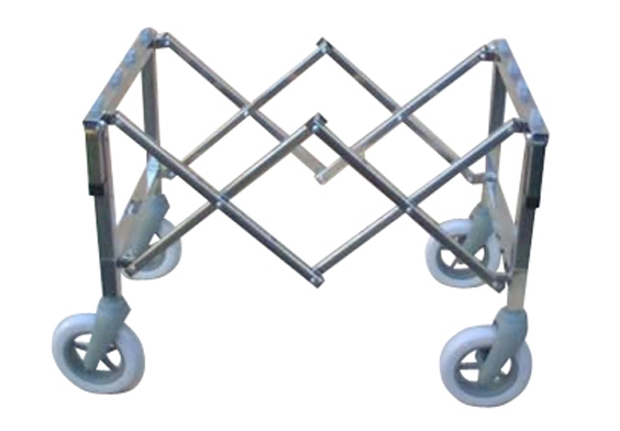 A stainless steel tubing bier which folds away along its length for easy storage and transportation. Comes complete with 7 inch wheels, four carrying handles and a leatherette cover for protection.