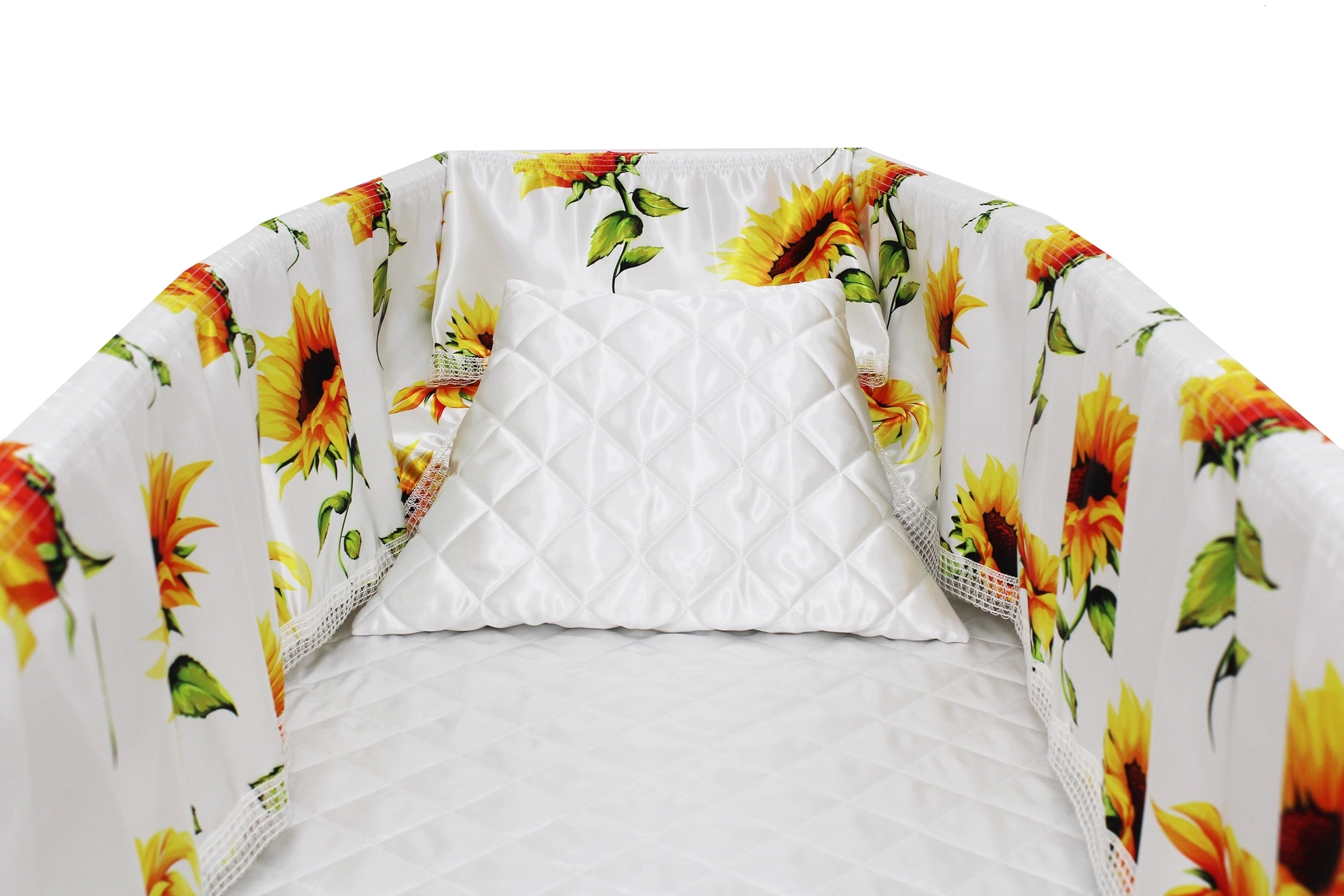 Luxury satin interior printed using water-based ink. The printed interior set consists of a 12-inch printed satin frill, printed satin facecloth, quilted satin pillow and a quilted satin mattress.