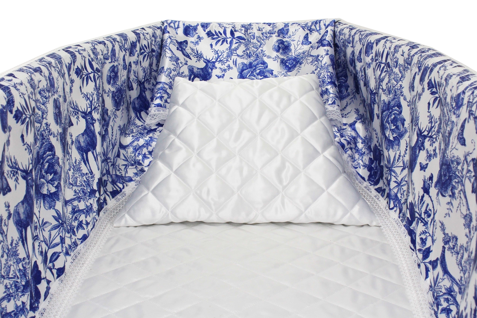 Luxury satin interior printed using water-based ink. The printed interior set consists of a 18-inch 2 Way printed satin frill, printed satin facecloth, quilted satin pillow and a quilted satin mattress.The chosen design will be printed on the interior. Image is to illustrate style of Interior Only.