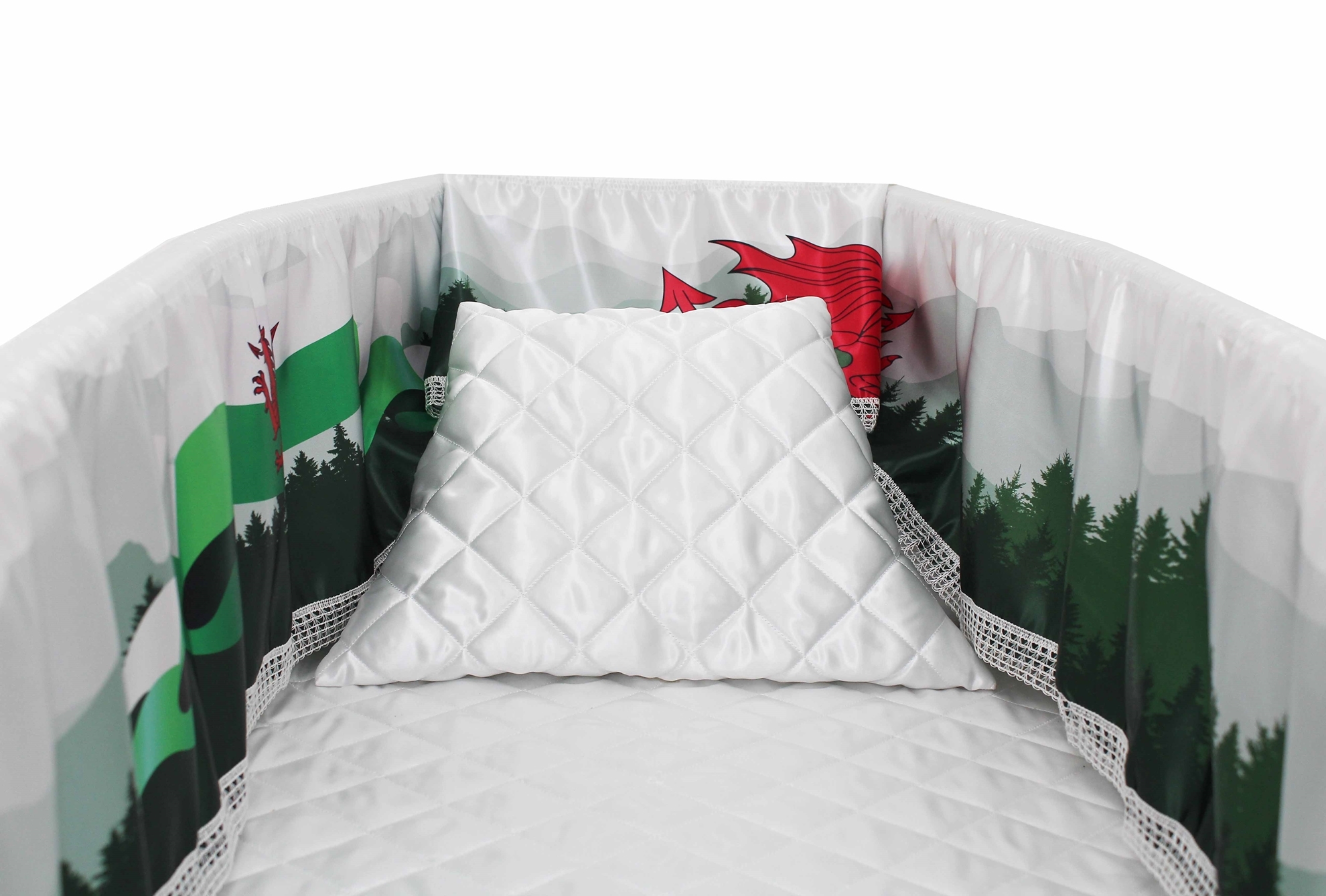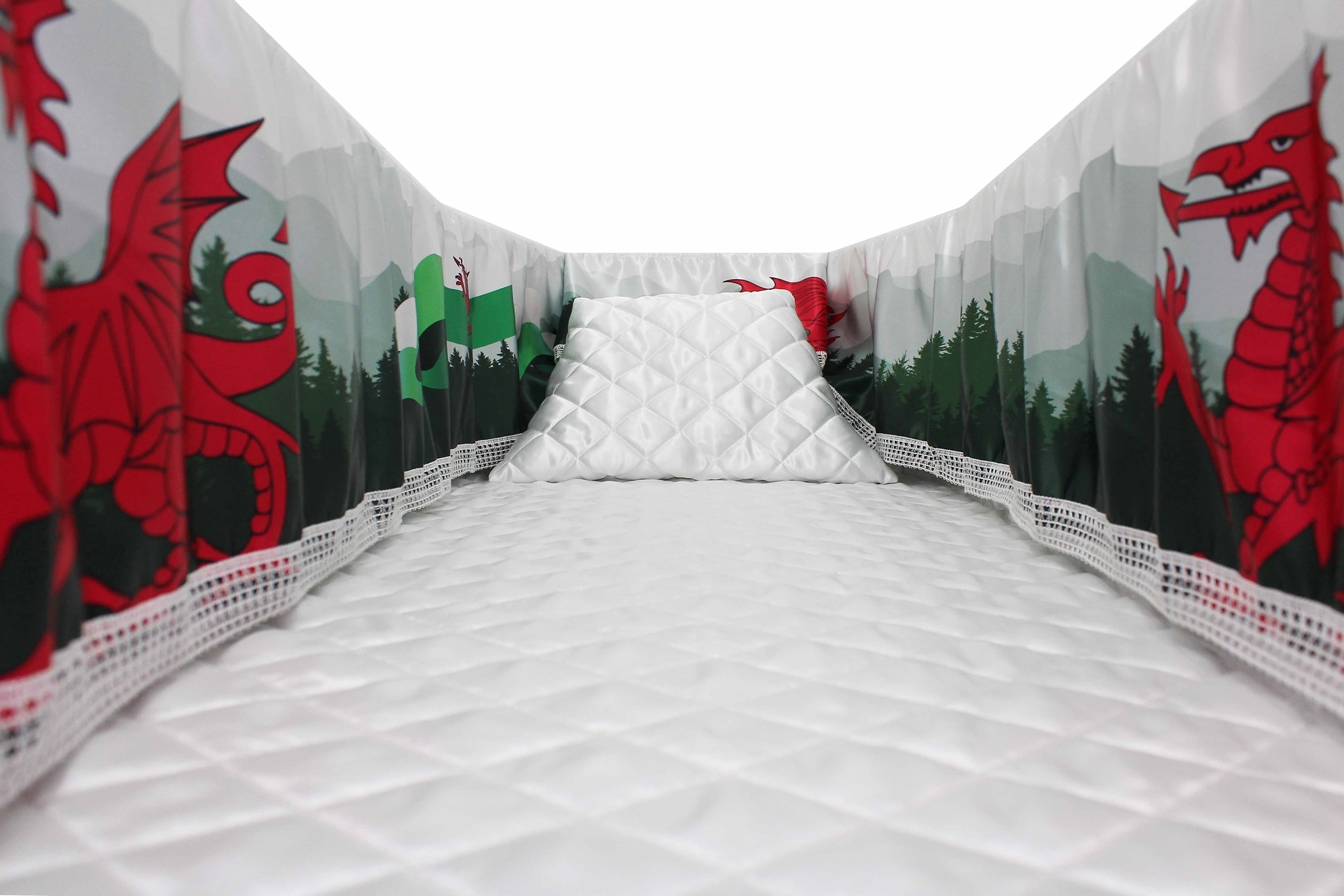 12-inch Printed Satin frill to be attached to the lip of the coffin/casket. Please note the image shows a mattress and pillow which are NOT included.