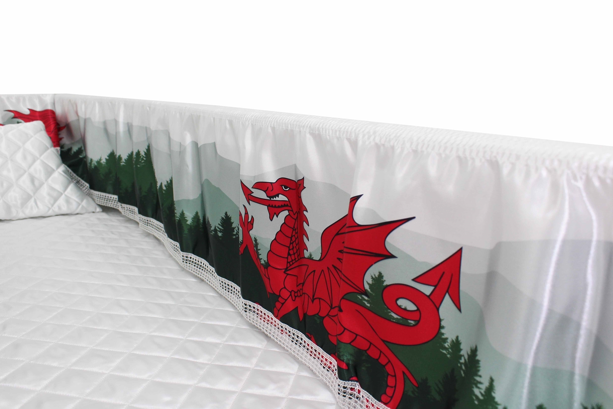 Luxury Satin 18-inch 2-way frill consisting of a 12-inch internal frill with an additional 6-inch exterior frill. The chosen design will be printed on the 18" 2-Way Frill. Please note the image shows a mattress and a pillow which are NOT included. Image is to illustrate style of Interior Only.