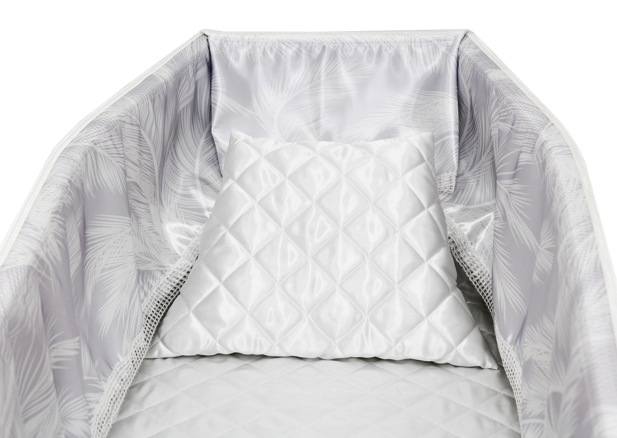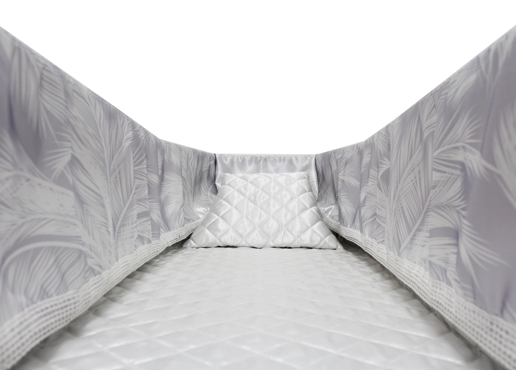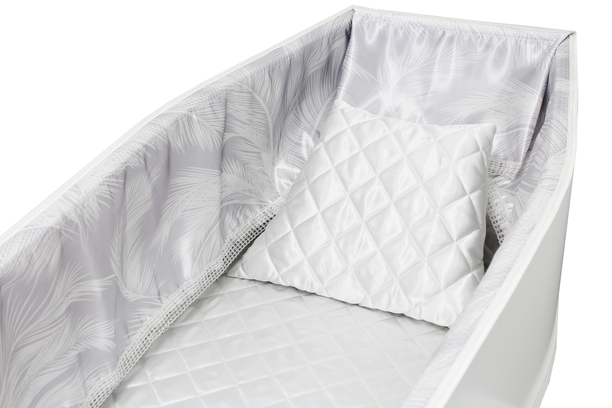Luxury satin interior printed using water-based ink. The printed interior set consists of a 12-inch printed satin frill, printed satin facecloth, quilted satin pillow and a quilted satin mattress.