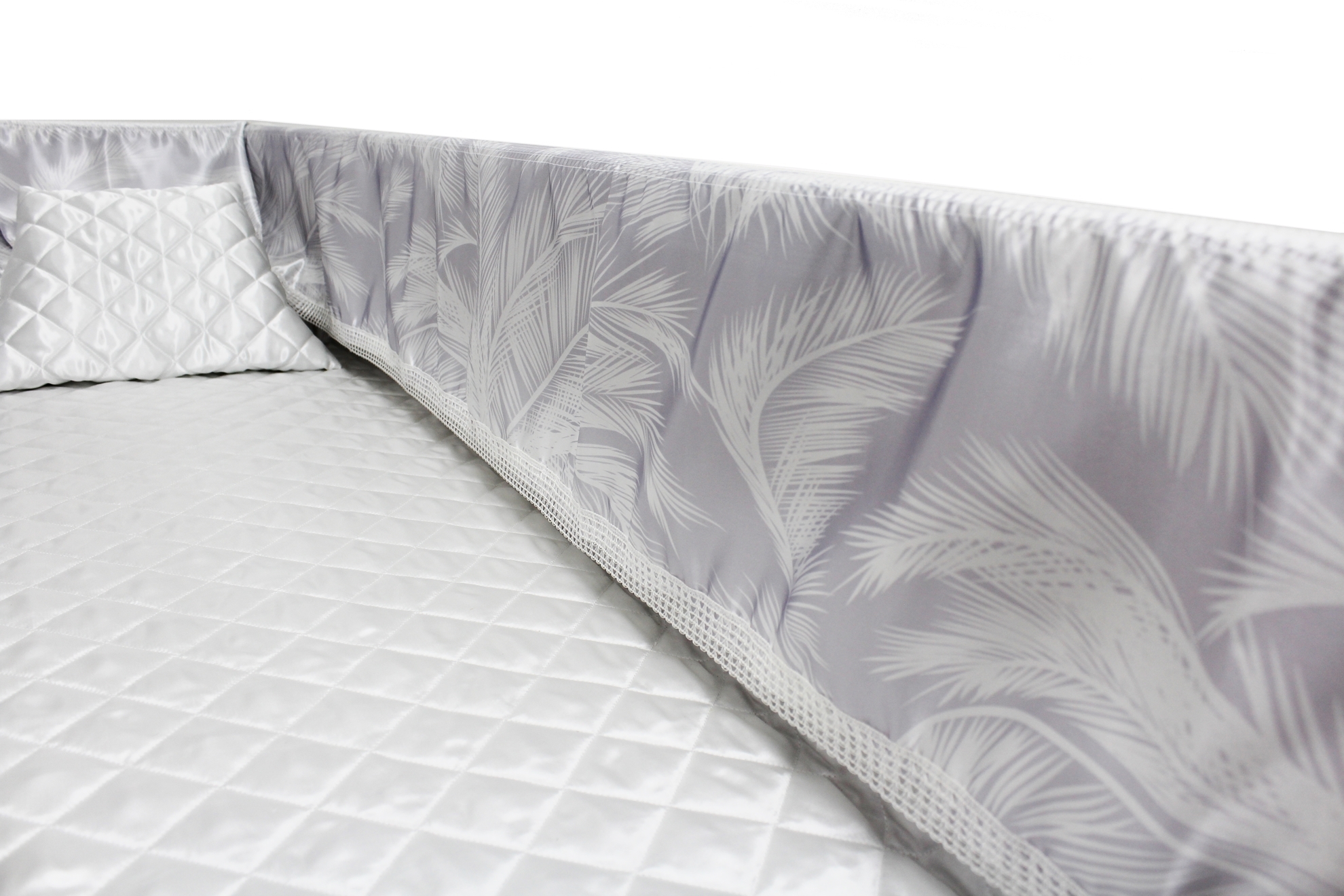 Luxury Satin 18-inch 2-way frill consisting of a 12-inch internal frill with an additional 6-inch exterior frill. The chosen design will be printed on the 18" 2-Way Frill. Please note the image shows a mattress and a pillow which are NOT included. Image is to illustrate style of Interior Only.