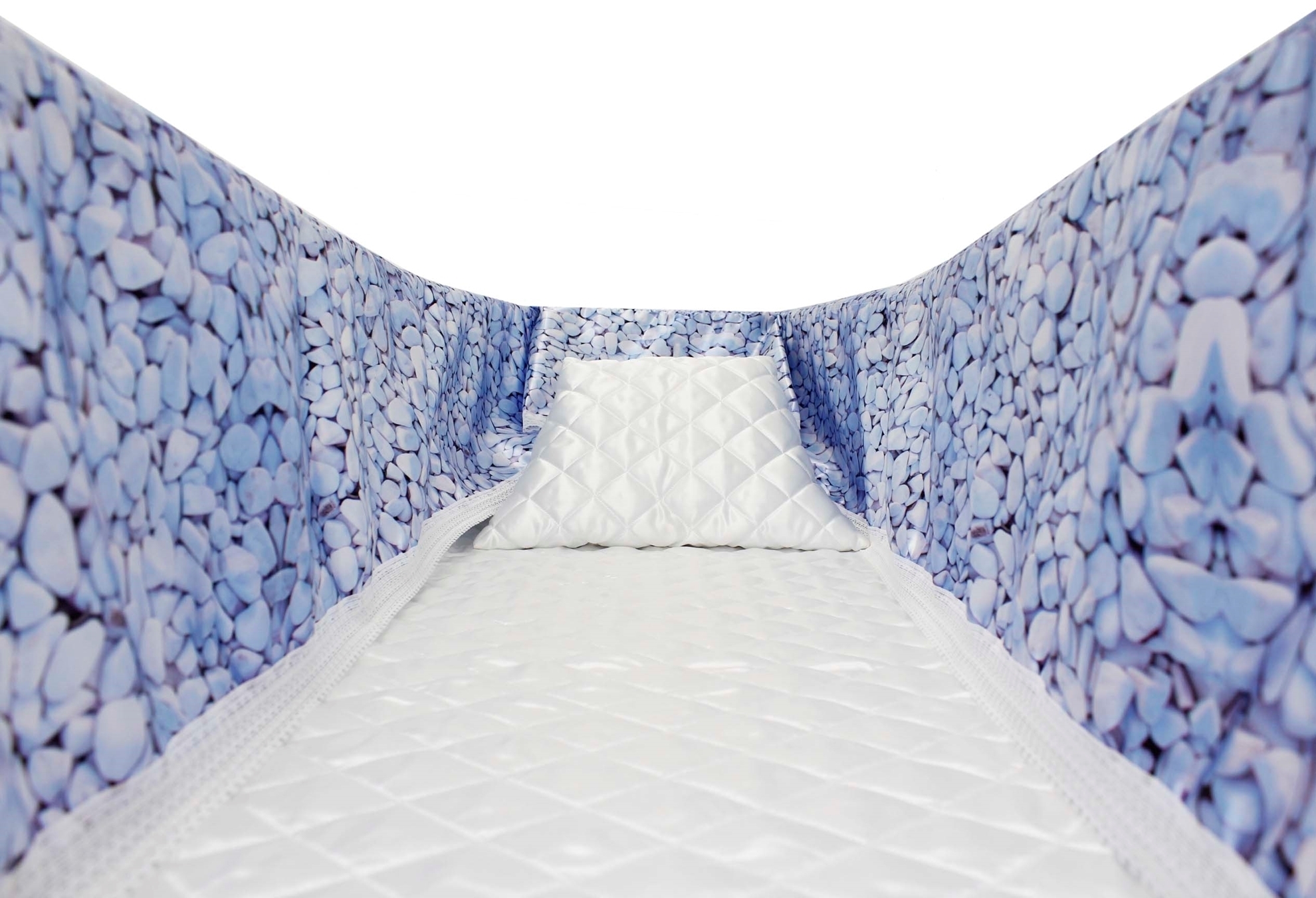 Luxury satin interior printed using water-based ink. The printed interior set consists of a 18-inch 2 Way printed satin frill, printed satin facecloth, quilted satin pillow and a quilted satin mattress.The chosen design will be printed on the interior. Image is to illustrate style of Interior Only.