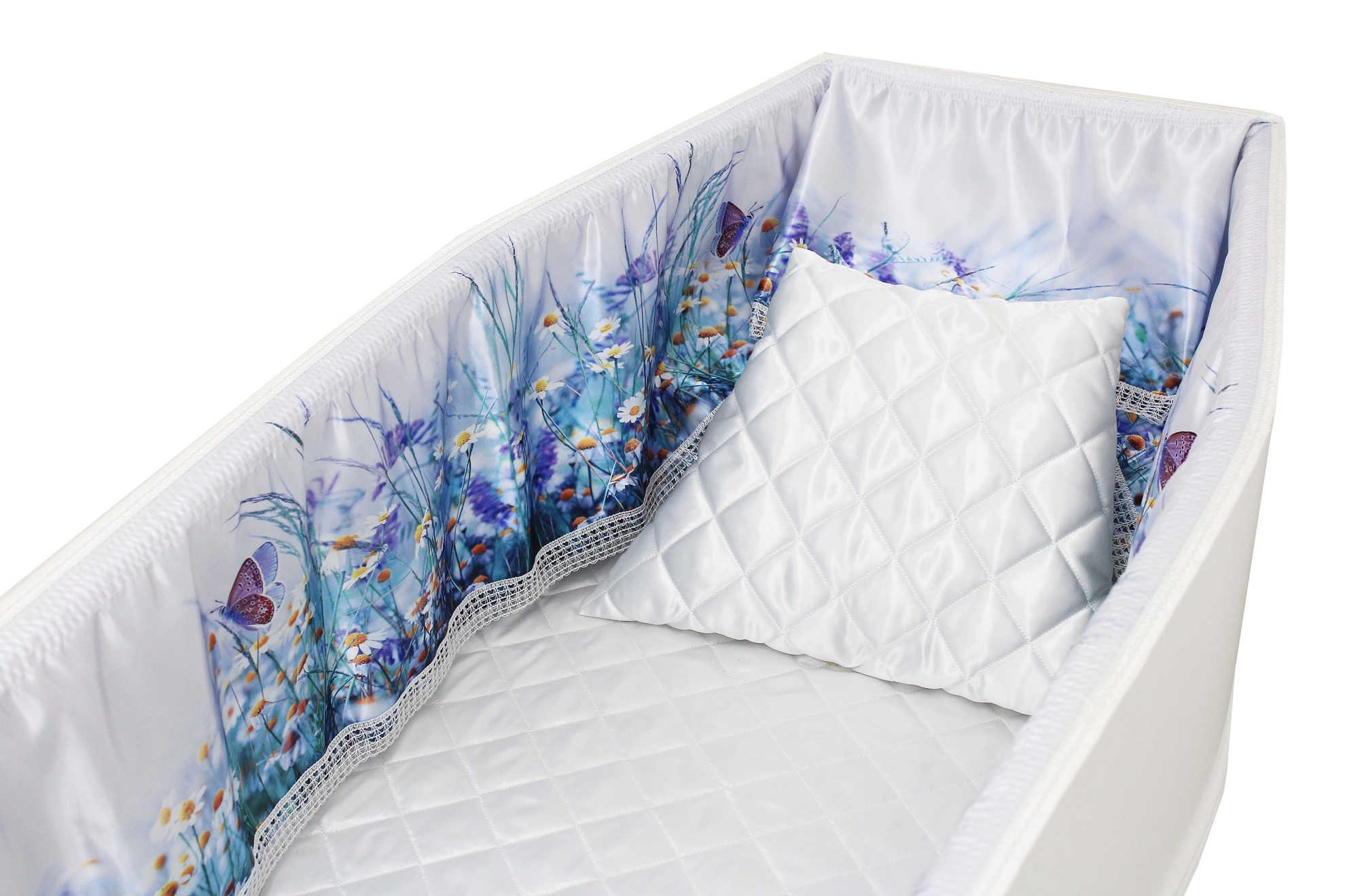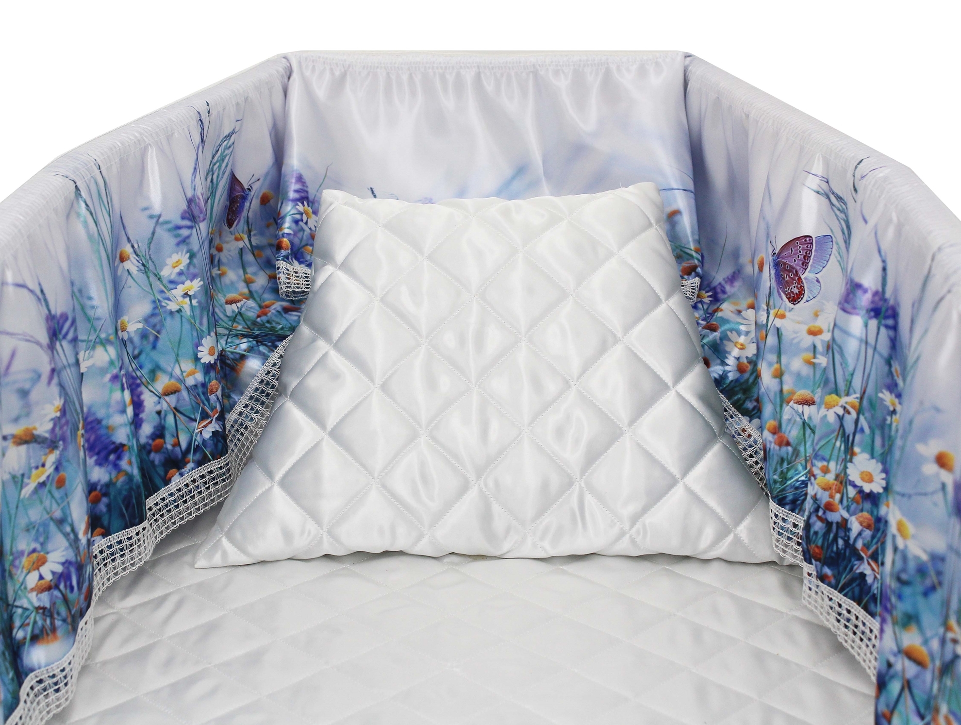 Luxury satin interior printed using water-based ink. The printed interior set consists of a 12-inch printed satin frill, printed satin facecloth, quilted satin pillow and a quilted satin mattress.