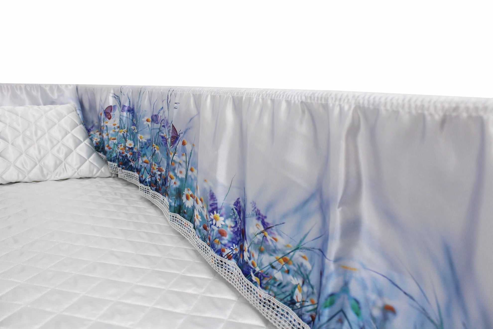 Luxury Satin 18-inch 2-way frill consisting of a 12-inch internal frill with an additional 6-inch exterior frill. The chosen design will be printed on the 18" 2-Way Frill. Please note the image shows a mattress and a pillow which are NOT included. Image is to illustrate style of Interior Only.