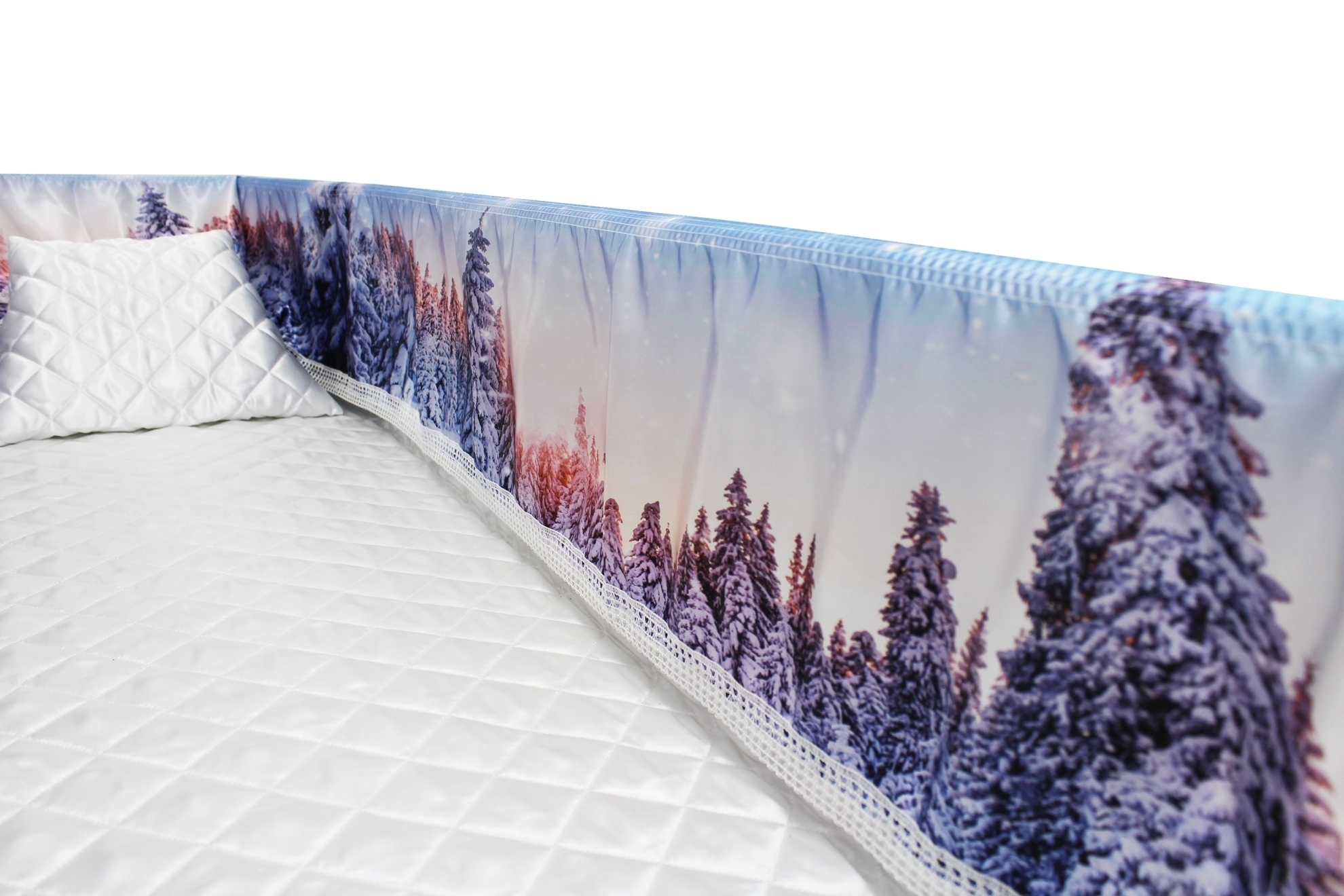 Luxury Satin 18-inch 2-way frill consisting of a 12-inch internal frill with an additional 6-inch exterior frill. The chosen design will be printed on the 18" 2-Way Frill. Please note the image shows a mattress and a pillow which are NOT included. Image is to illustrate style of Interior Only.
