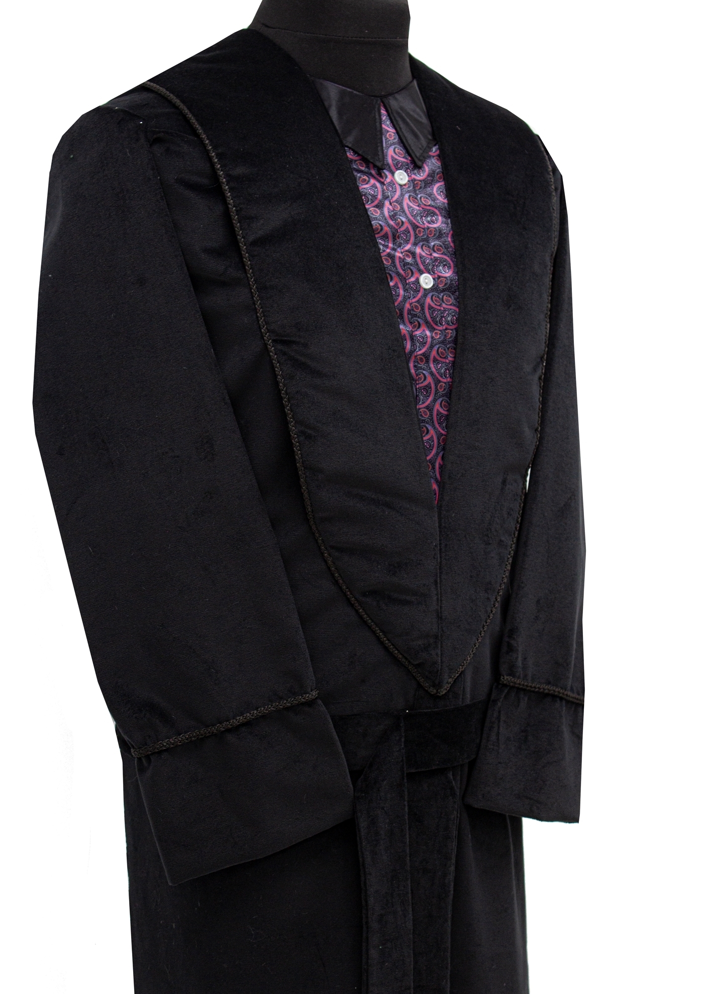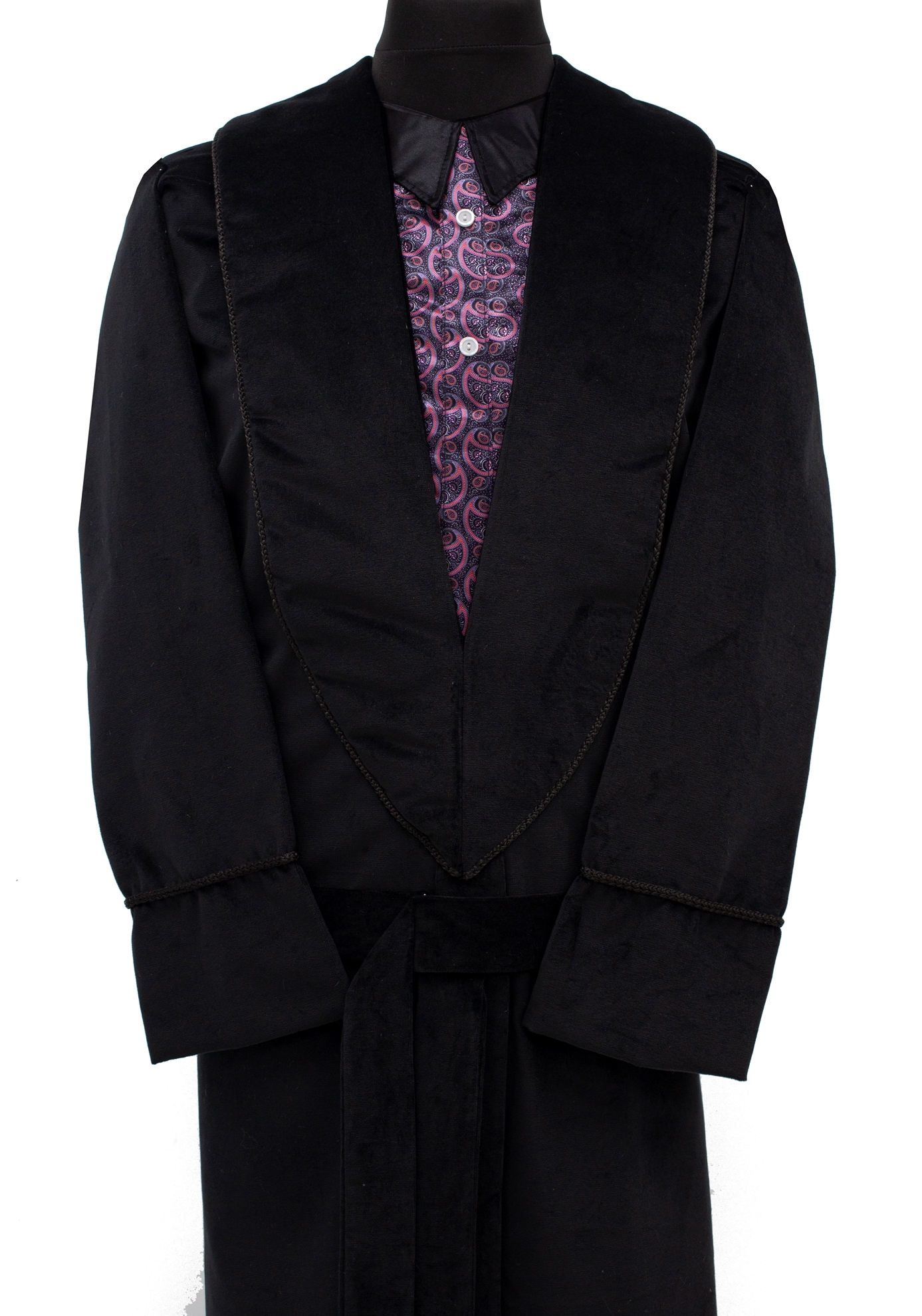 100% Cotton Velvet Dressing Gown Style with a Pyjama Front. Available in Bottle Green, Maroon, Black, Grey and Navy Blue with an option of a 9" or 12" Frill.