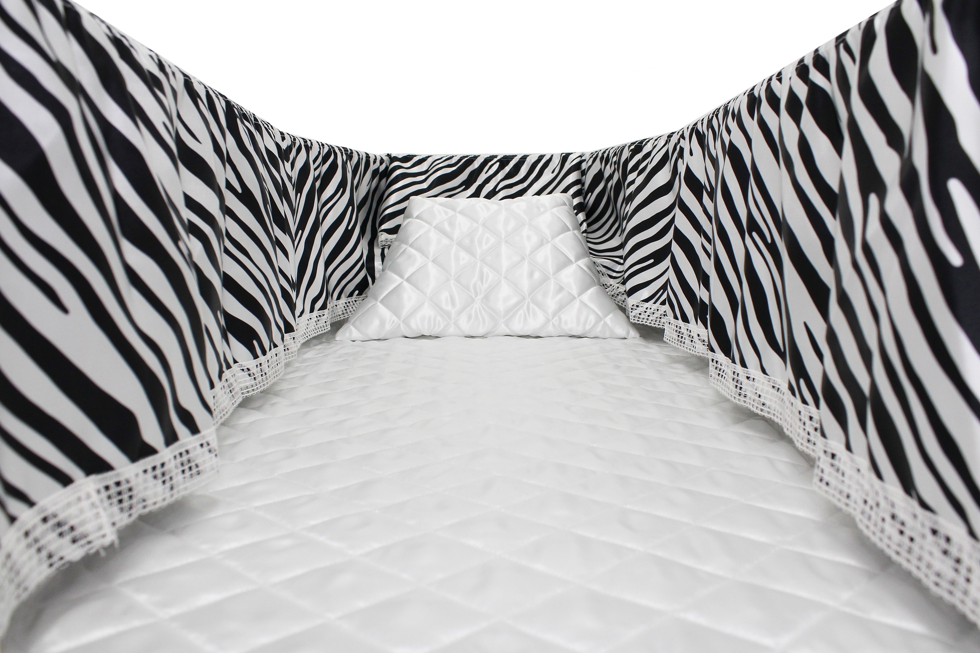Luxury satin interior printed using water-based ink. The printed interior set consists of a 12-inch printed satin frill, printed satin facecloth, quilted satin pillow and a quilted satin mattress.