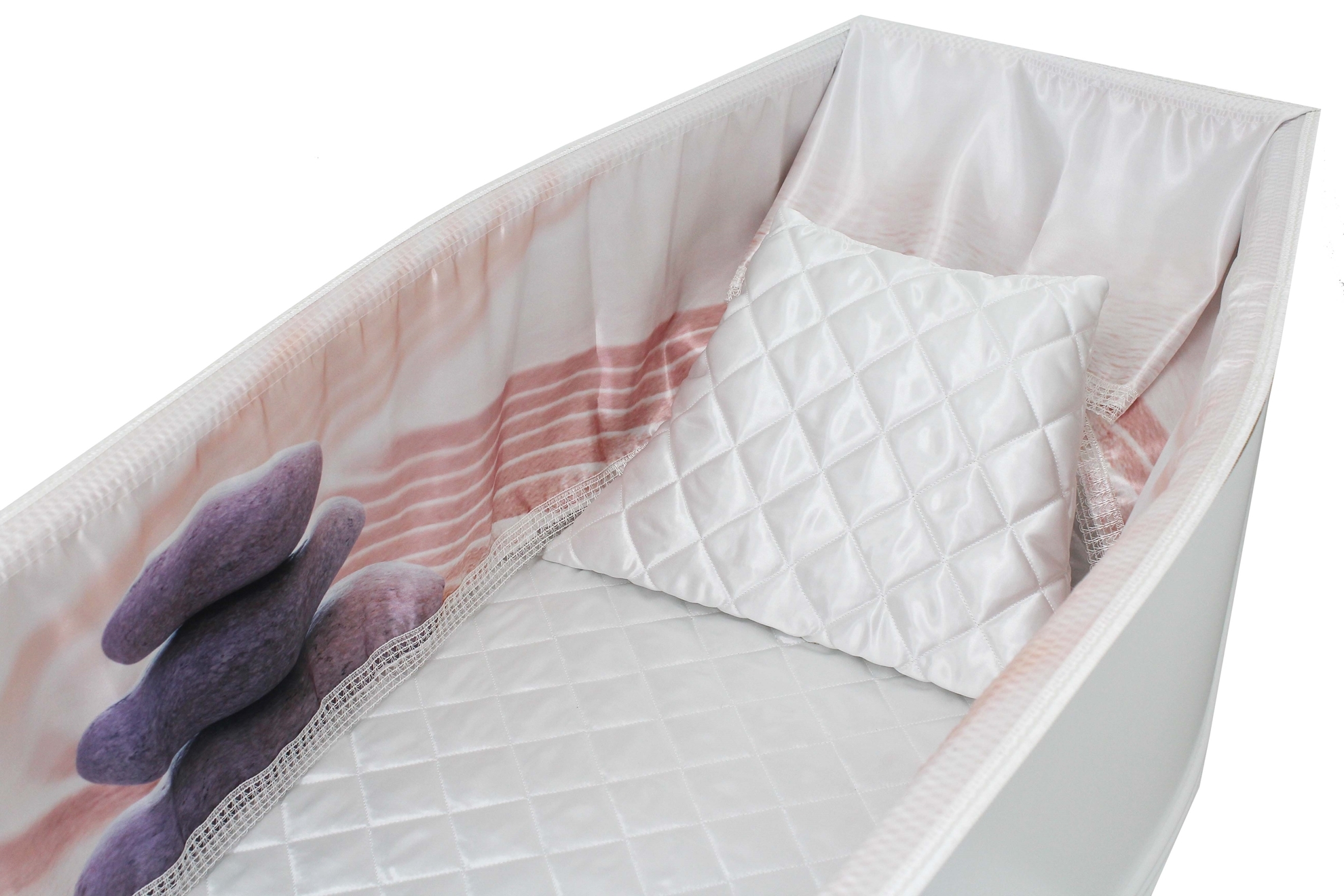 Luxury satin interior printed using water-based ink. The printed interior set consists of a 18-inch 2 Way printed satin frill, printed satin facecloth, quilted satin pillow and a quilted satin mattress.The chosen design will be printed on the interior. Image is to illustrate style of Interior Only.