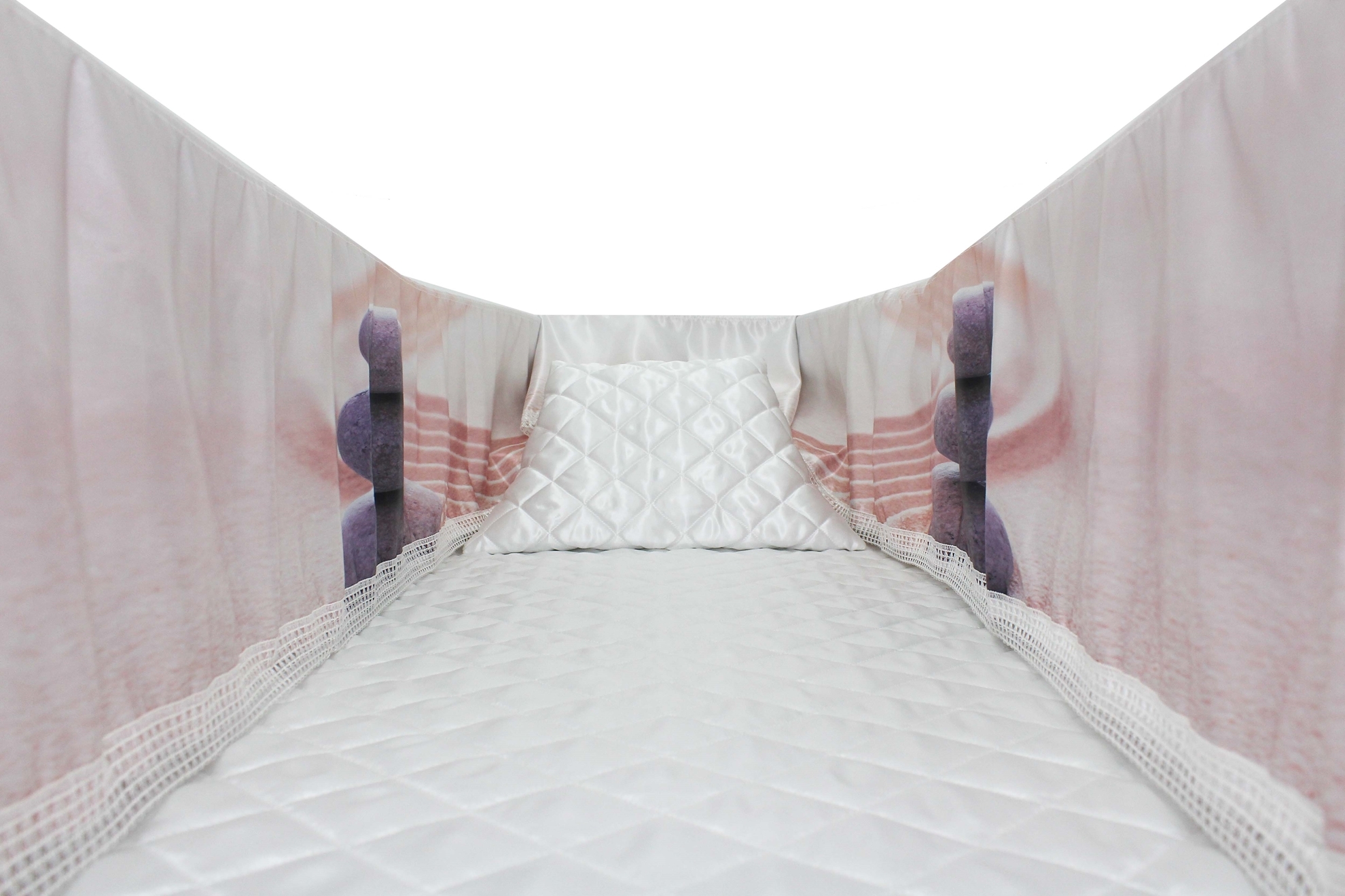 Luxury satin interior printed using water-based ink. The printed interior set consists of a 12-inch printed satin frill, printed satin facecloth, quilted satin pillow and a quilted satin mattress.